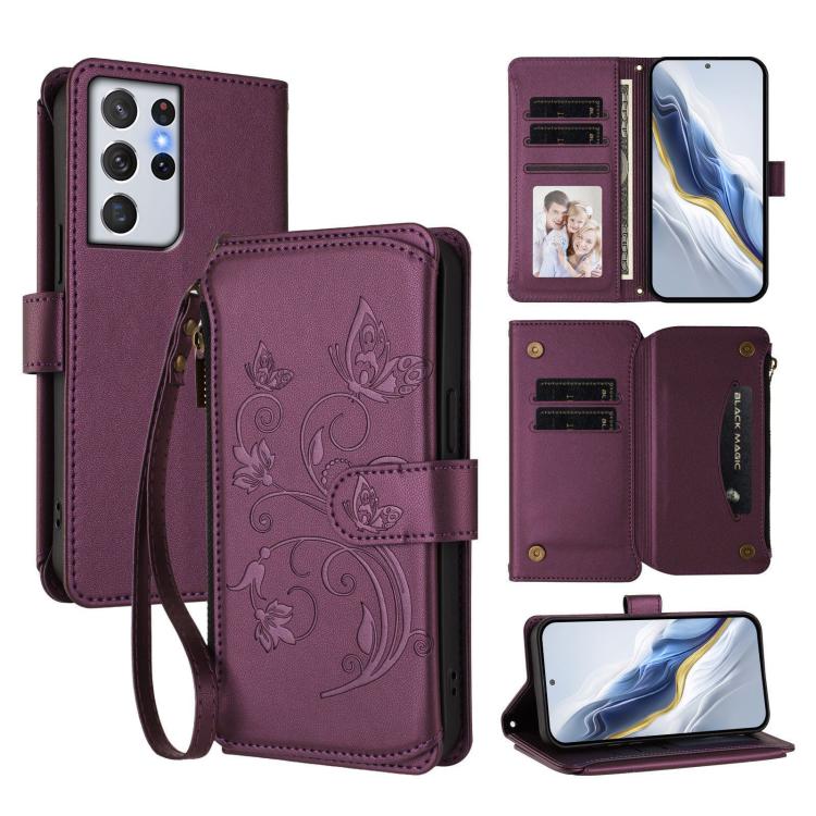 Funda de cuero con cremallera para Samsung Galaxy S21 Ultra 5G, diseño de mariposas, flores y amor, con múltiples tarjetas (morado oscuro)