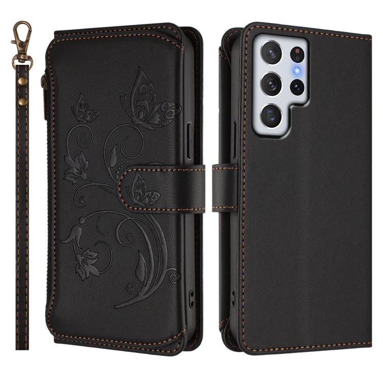 Funda de cuero con cremallera para Samsung Galaxy S22 Ultra 5G, diseño de mariposas, flores y múltiples tarjetas (negro)