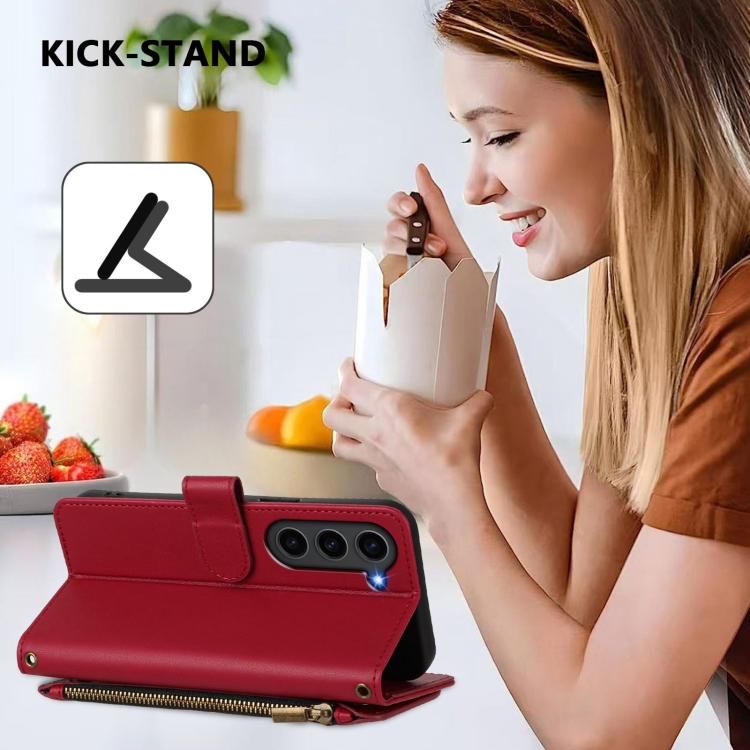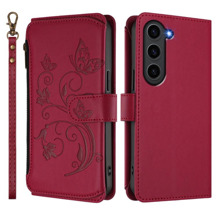 Funda de cuero con cremallera para Samsung Galaxy S23 5G, diseño de mariposas, flores y amor, con múltiples tarjetas (rojo vino)