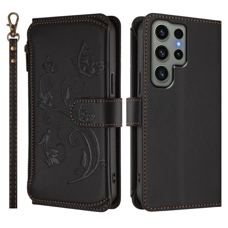 Funda de cuero con cremallera para Samsung Galaxy S23 Ultra 5G, diseño de mariposas, flores y múltiples tarjetas (negro)