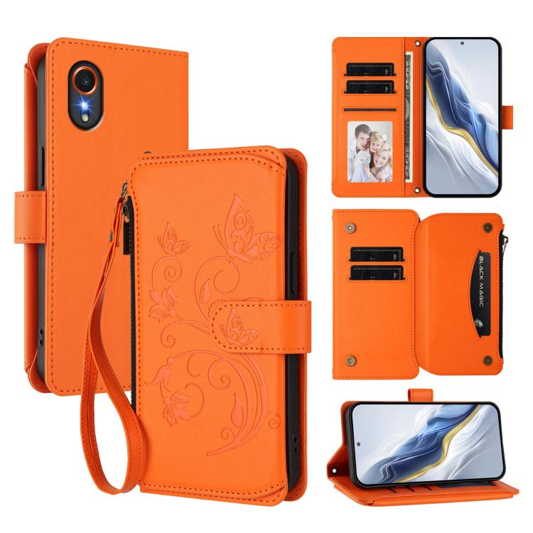 Funda de cuero con cremallera para Samsung Galaxy XCover7 5G, diseño de mariposas, flores y amor, con múltiples tarjetas (naranja)