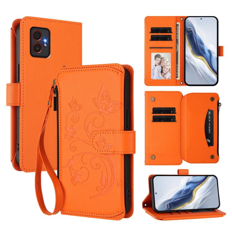Funda de cuero con cremallera para Samsung Galaxy XCover7 Pro, diseño de mariposas, flores y amor (naranja)