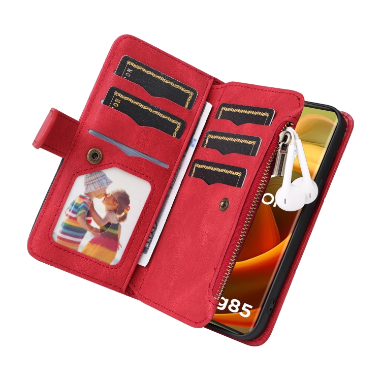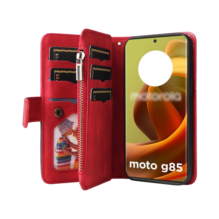 Funda de Cuero con Cremallera para Motorola Moto G85 con 9 Ranuras para Tarjetas (Rojo)
