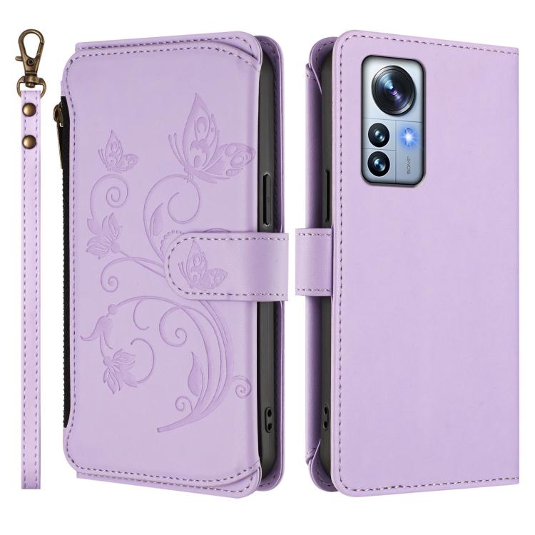 Funda de cuero con cremallera para Xiaomi 12 Pro / 12S Pro, diseño de mariposas, flores y múltiples tarjetas (morado claro)