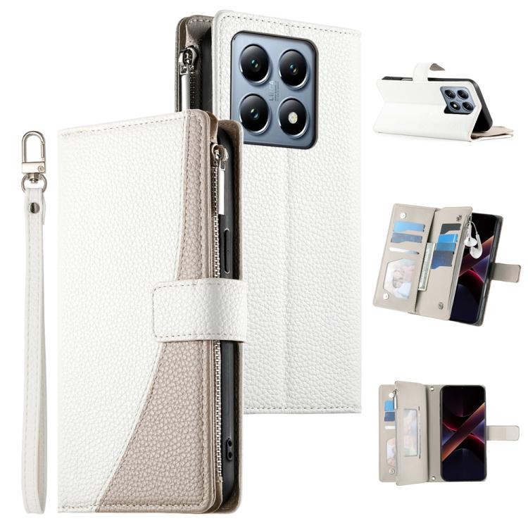 Funda de cuero con cremallera para Xiaomi 14T Pro, con múltiples tarjetas y costuras, con correa corta (blanca)