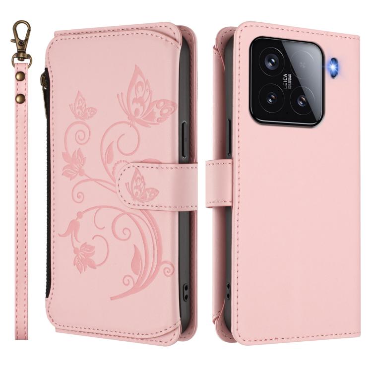 Funda de cuero con cremallera para Xiaomi 15, diseño de mariposas y flores, con múltiples tarjetas (rosa)
