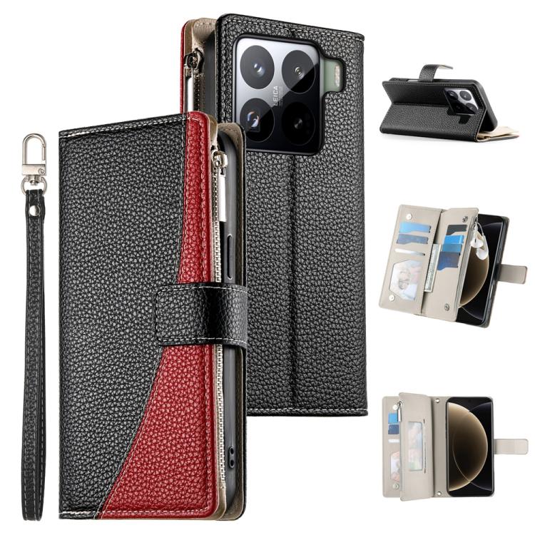 Funda de cuero con cremallera para Xiaomi 15 Pro, con múltiples tarjetas y costuras, con correa corta (negra)