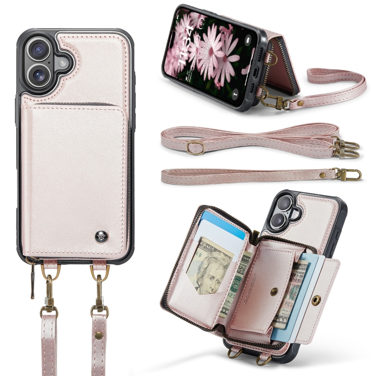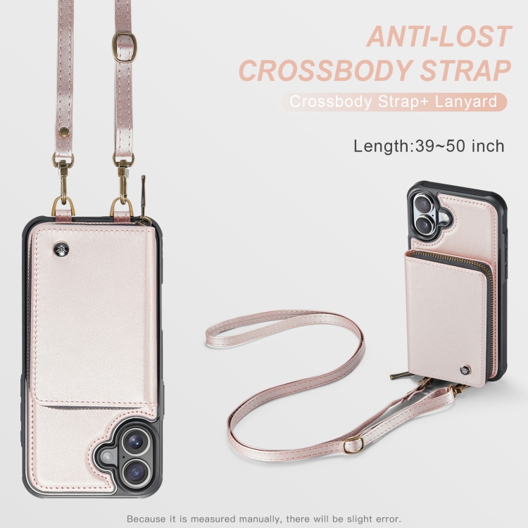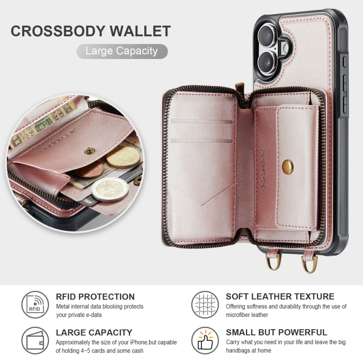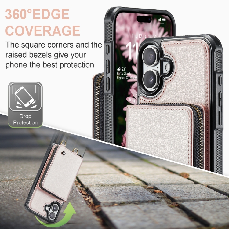 Funda de Cuero con Cremallera y Cordón Doble para iPhone 16 Plus Jeehood C22 Series (Oro Rosa)
