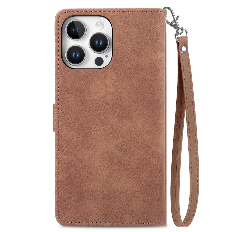 Funda de Cuero con Cremallera para iPhone 16 Pro Max (Marrón) con Diseño de Flores en Relieve