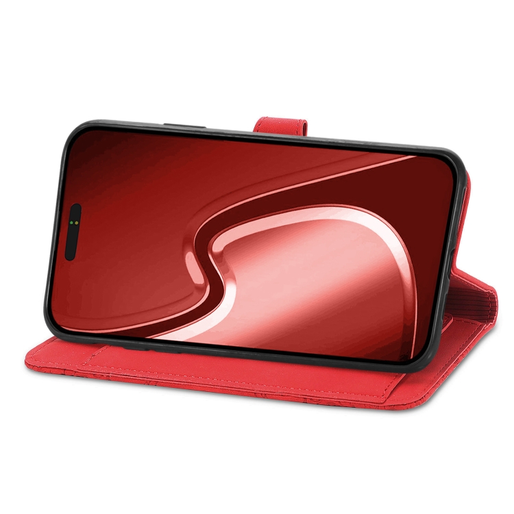 Funda de Cuero con Cremallera y Diseño de Flores en Relieve para iPhone 16 (Rojo)