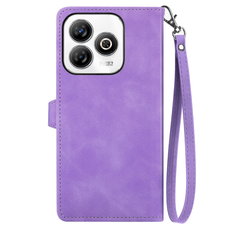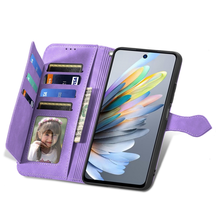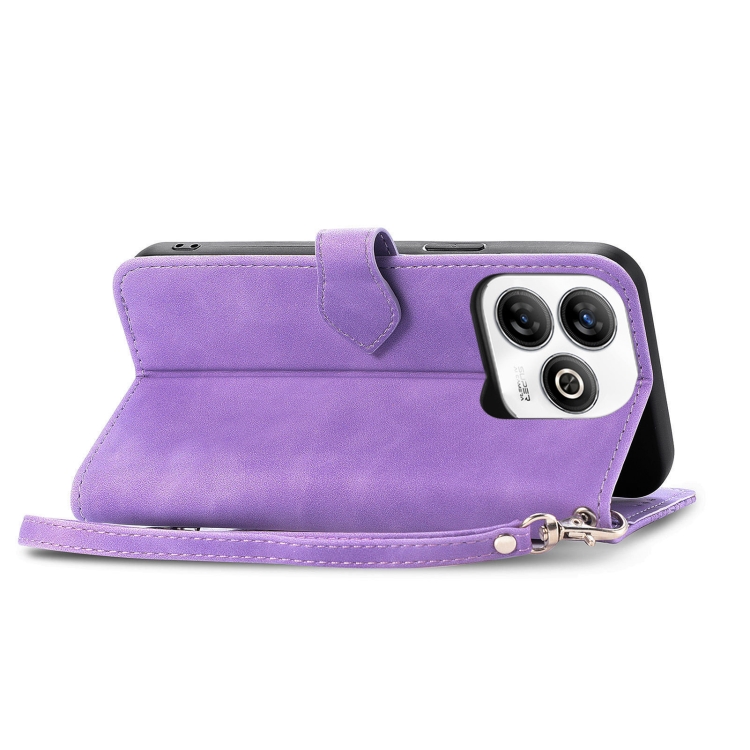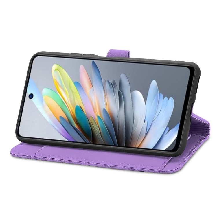 Funda de Cuero para ZTE Blade A75 4G con Cremallera y Flores en Relieve (Morado)