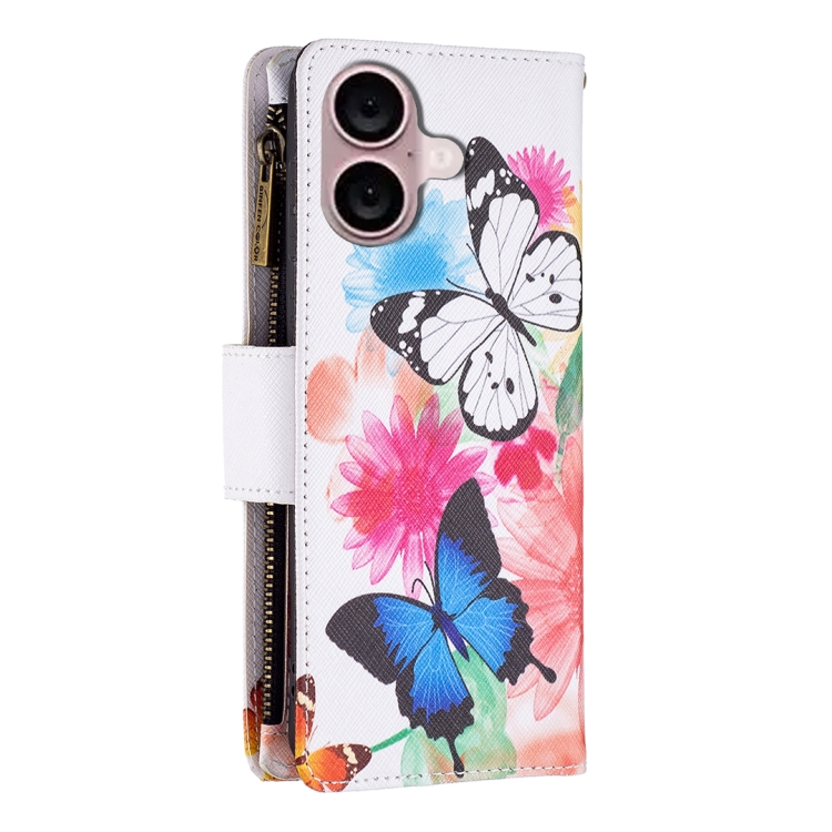 Funda de Cuero con Cremallera para iPhone 16 Plus con Dibujo de Dos Mariposas