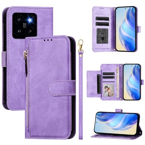 Funda de Cuero con Cremallera y Ranuras para Múltiples Tarjetas para Xiaomi 14 Pro Global (Morado)