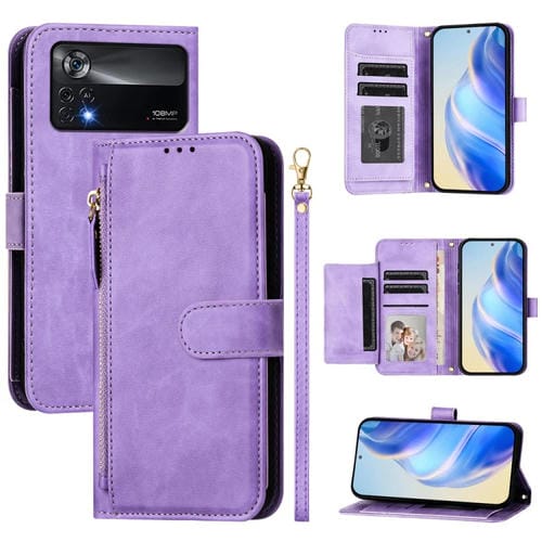 Funda de Cuero con Cremallera y Ranuras para Múltiples Tarjetas para Xiaomi Poco X4 Pro 5G (Morado)