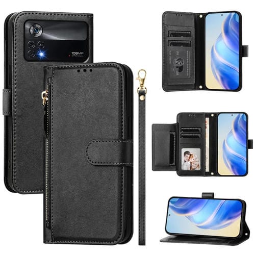 Funda de Cuero con Cremallera y Ranuras para Múltiples Tarjetas para Xiaomi Poco X4 Pro 5G (Negro)