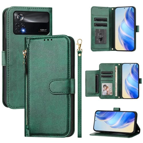 Funda de Cuero con Cremallera y Ranuras para Múltiples Tarjetas para Xiaomi Poco X4 Pro 5G (Verde)