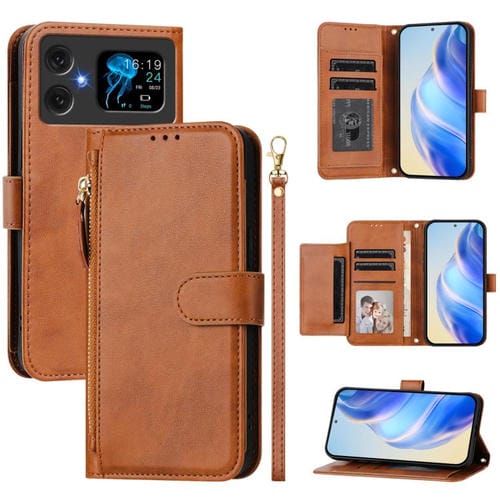 Funda de Cuero para Cubot A20 con Cremallera y Ranuras para Tarjetas (Marrón)