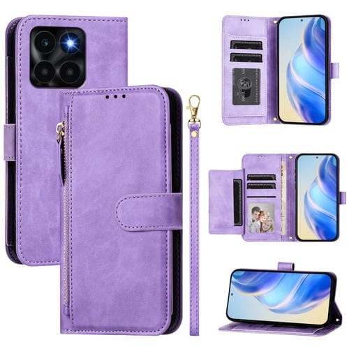 Funda de Cuero Tipo Billetera para Honor X6A 4G con Cremallera y Ranuras (Morado)