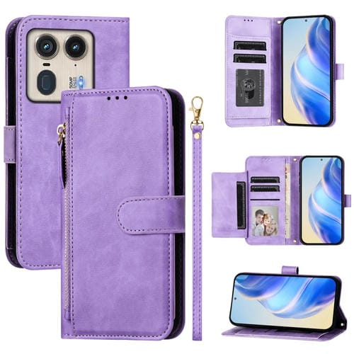 Funda de Cuero con Cremallera y Ranuras para Tarjetas para Motorola Edge 50 Ultra/Moto X50 Ultra (Morado)