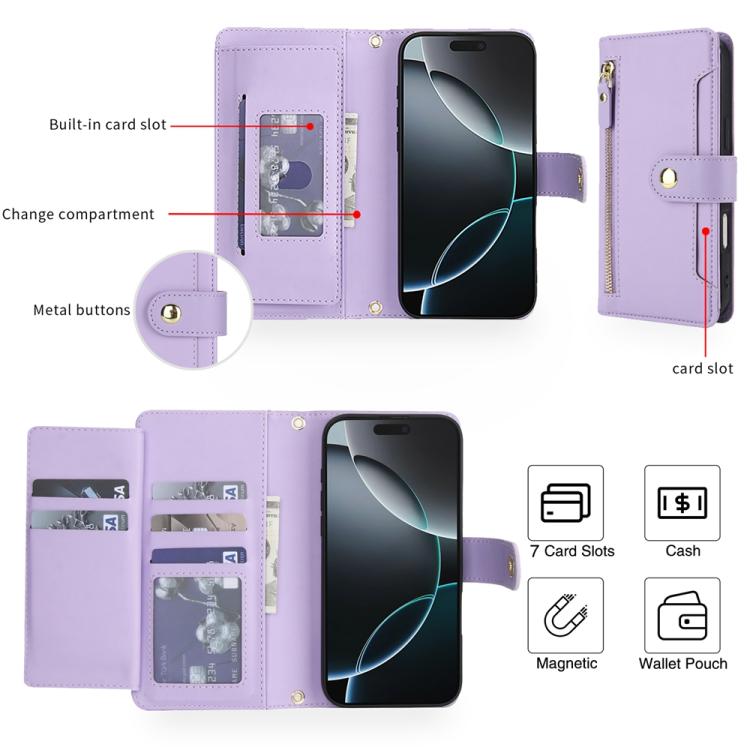 Funda de cuero con cremallera y siete ranuras para tarjetas para iPhone 17 Pro Max con cordón (morado claro)