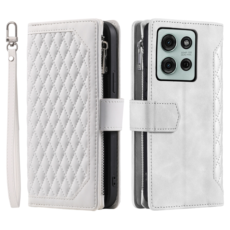 Funda de Cuero para Motorola Moto G75 5G con Cremallera y Textura de Cuadrícula (Blanco)