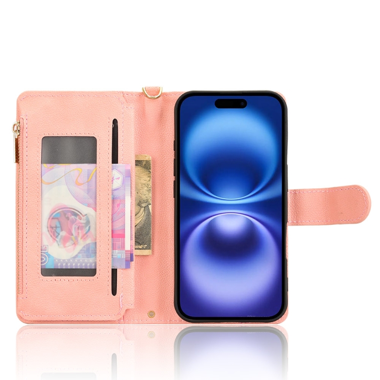 Funda de Cuero con Cremallera y Textura de Lichi para iPhone 16 Plus (Rosa)