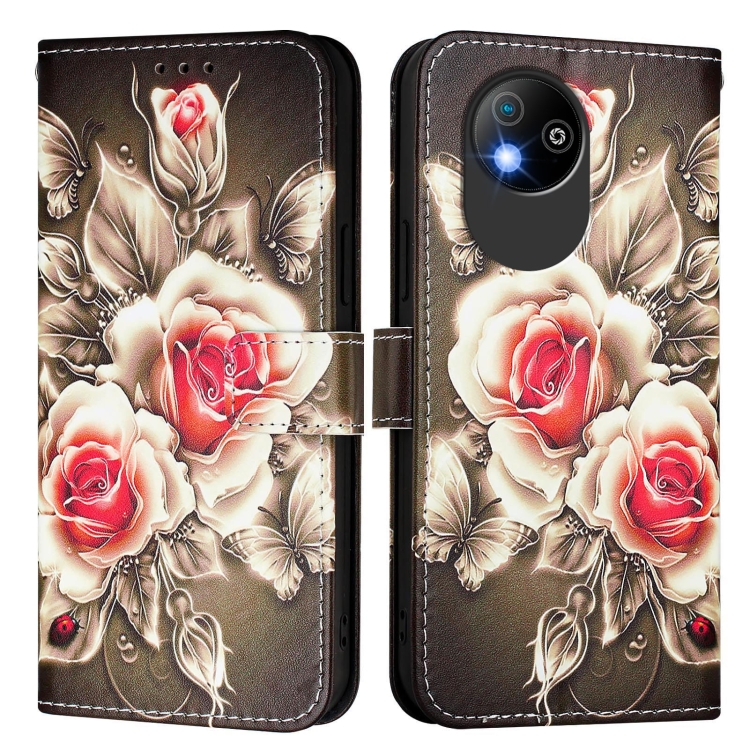 Funda de Cuero para ZTE Blade A35 Lite/A35 Core con Diseño de Dibujos (Rosas Sobre Negro)