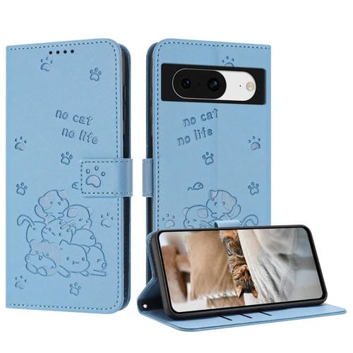 Funda de Cuero para Google Pixel 8A con Diseño de Gatito en Relieve y Cordón (Azul)