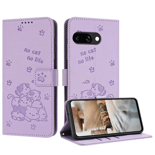 Funda de Cuero para Google Pixel 9A con Diseño de Gatito en Relieve y Cordón (Morado)