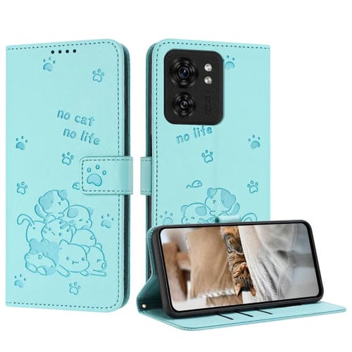 Funda de Cuero para Motorola Edge 40 con Diseño de Gatito en Relieve y Cordón (Verde Menta)