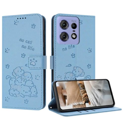 Funda de Cuero Motorola Edge 50 Pro con Diseño de Gatito En Relieve y Cordón (Azul)