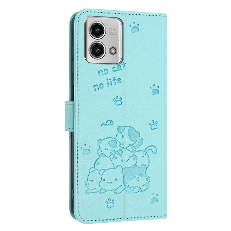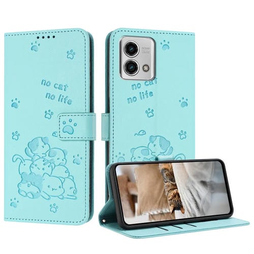 Funda de Cuero Motorola Moto G Stylus 2023 4G con Diseño de Gatito en Relieve y Cordón (Verde Menta)