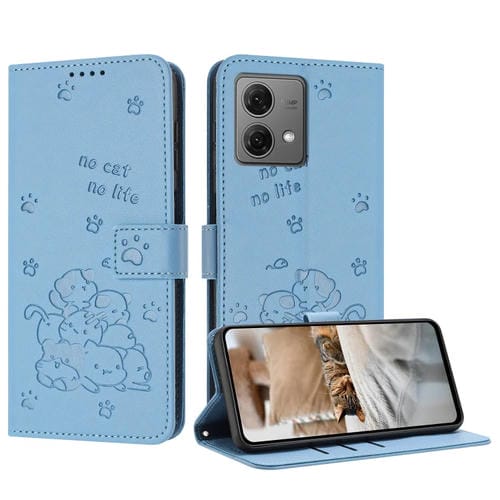 Funda de Cuero para Motorola Moto G84 con Diseño de Gatito en Relieve y Cordón (Azul)
