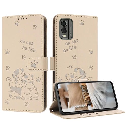 Funda de Cuero para Nokia C32 con Diseño de Gatito en Relieve y Cordón (Beige)