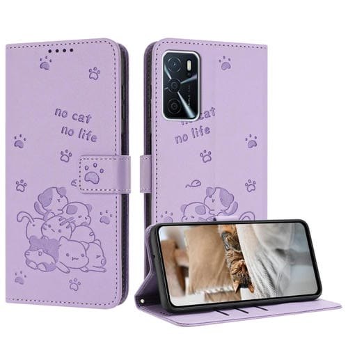 Funda de Piel con Diseño de Gatito En Relieve y Cordón para Oppo A16/A16S/A54S (Morado)