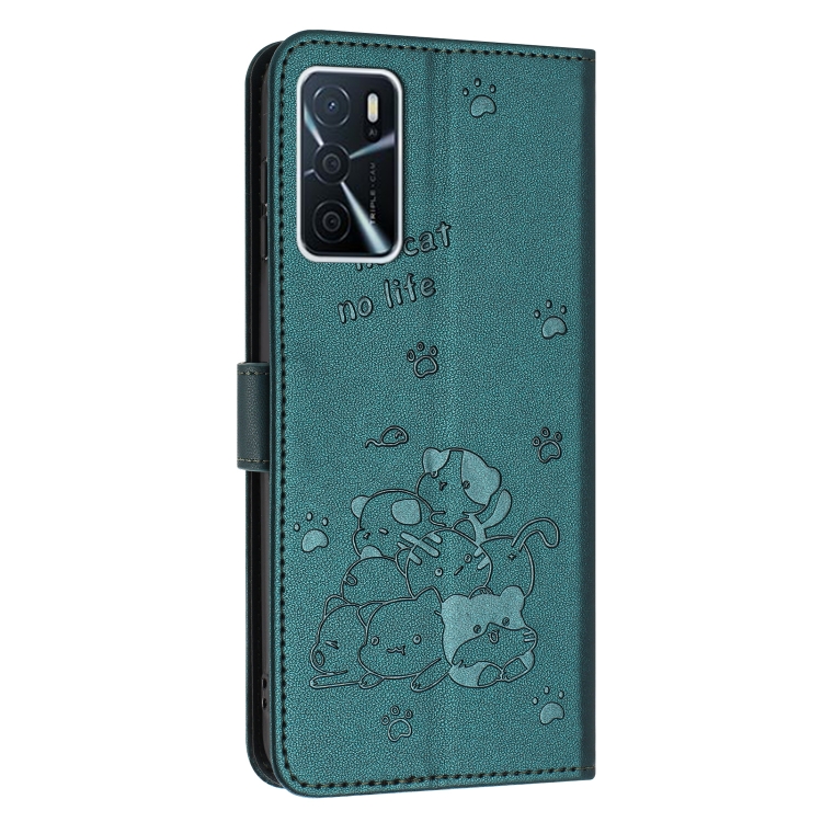 Funda de Piel con Diseño de Gatito En Relieve y Cordón para Oppo A16/A16S/A54S (Verde Oscuro)