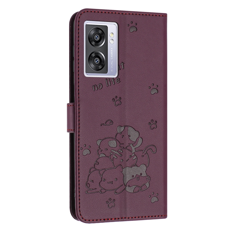 Funda de Piel con Estampado de Gatito y Cordón para Oppo A77 5G (Rojo Vino)