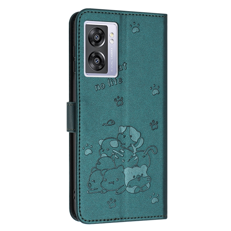 Funda de Piel con Diseño de Gatito En Relieve para Oppo A77 5G con Cordón (Verde Oscuro)