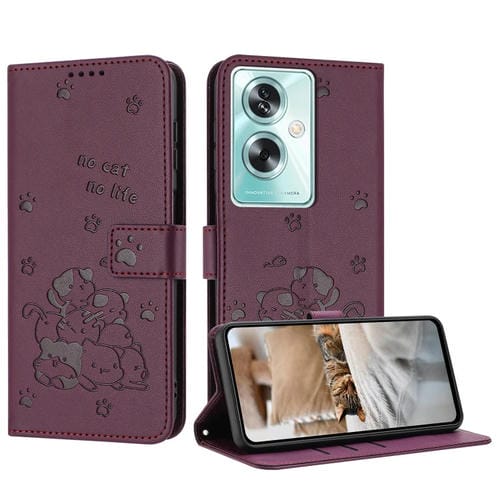 Funda de Piel con Estampado de Gatito y Cordón para Oppo A79 5G (Rojo Vino)
