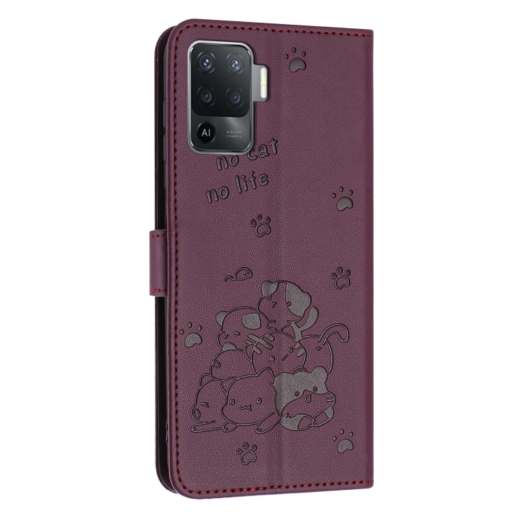 Funda de Piel con Diseño de Gatito En Relieve y Cordón para Oppo A94 4G / F19 Pro (Rojo Vino)