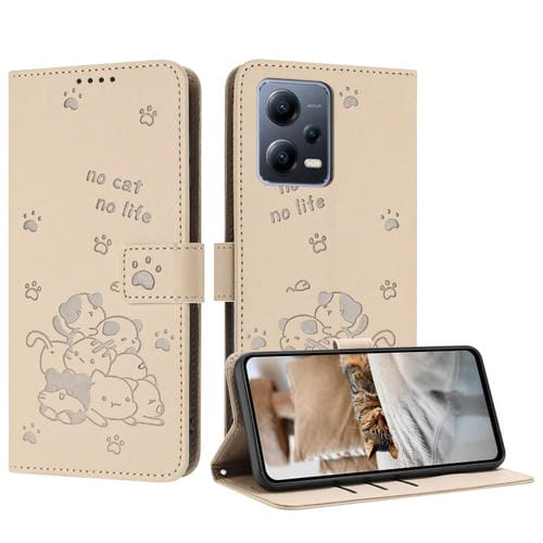 Funda de Cuero con Estampado de Gatito En Relieve para Redmi Note 12 5G con Cordón (Beige)