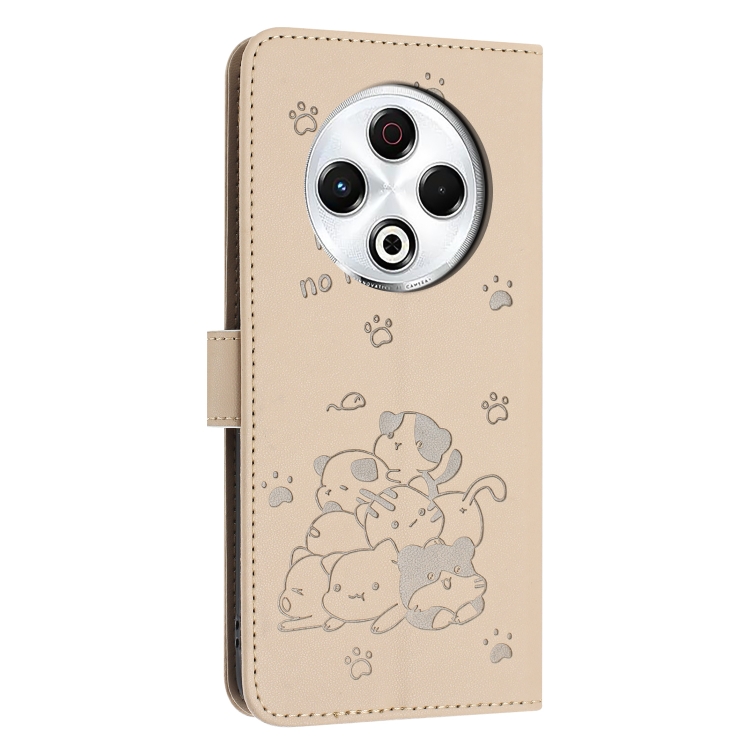 Funda de Cuero para Tecno Spark 30 4G con Diseño de Gatito en Relieve y Cordón (Beige)