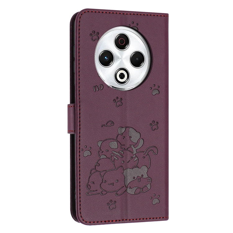 Funda de Cuero para Tecno Spark 30 4G con Diseño de Gatito En Relieve y Cordón (Rojo Vino)