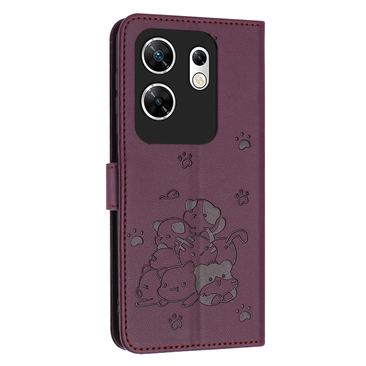 Funda de Cuero Infinix Zero 30 4G con Diseño de Gatito en Relieve y Cordón (Rojo Vino)