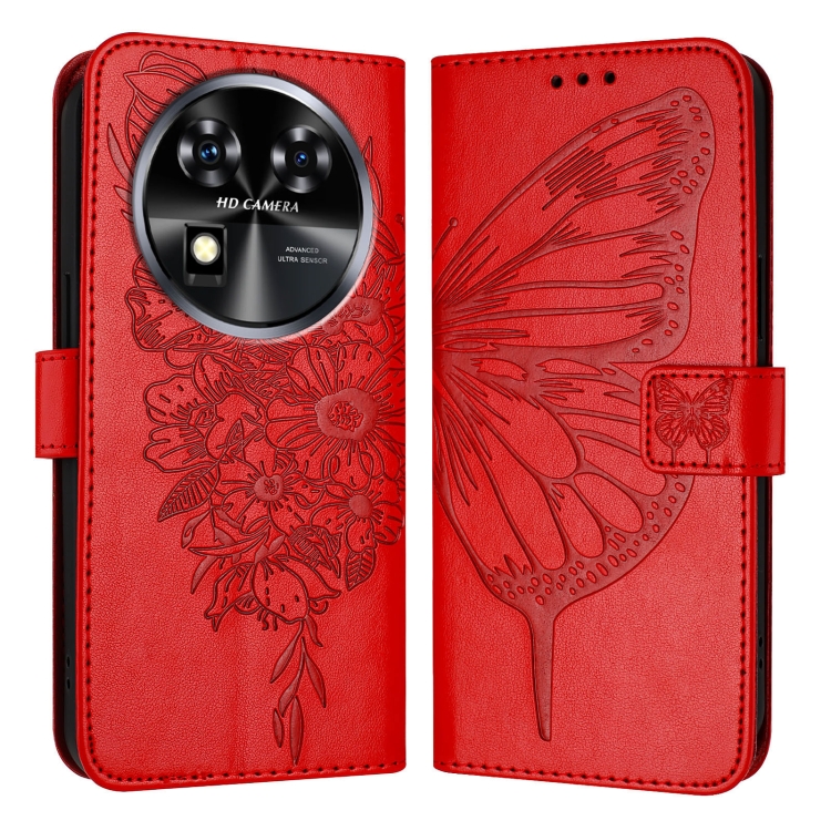 Funda de Cuero para Oukitel C37 con Diseño de Mariposa en Relieve (Rojo)