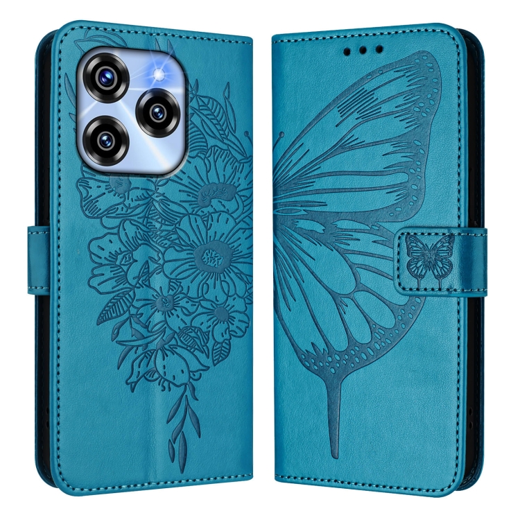 Funda de Cuero para Oukitel C50 con Diseño de Mariposa en Relieve (Azul)