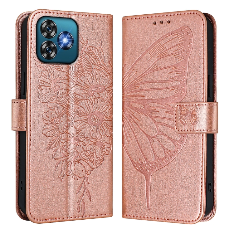 Funda de Cuero para Oukitel C53 con Diseño de Mariposa en Relieve (Oro Rosa)