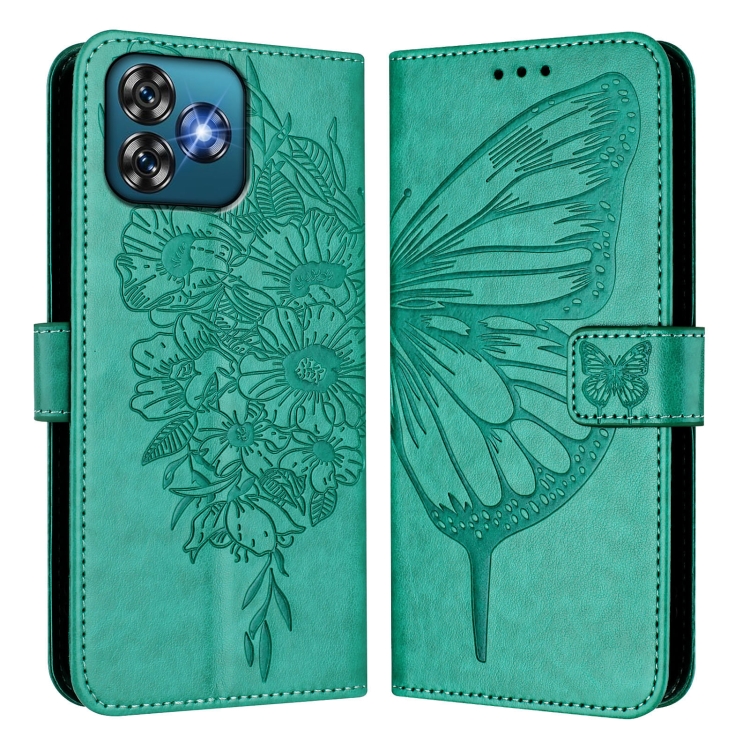 Funda de Cuero para Oukitel C53 con Diseño de Mariposa en Relieve (Verde)