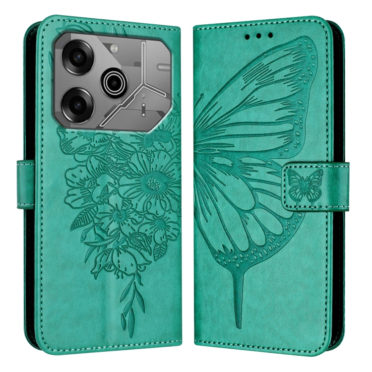 Funda de Cuero para Tecno Pova 6 Neo con Diseño de Mariposa en Relieve (Verde)