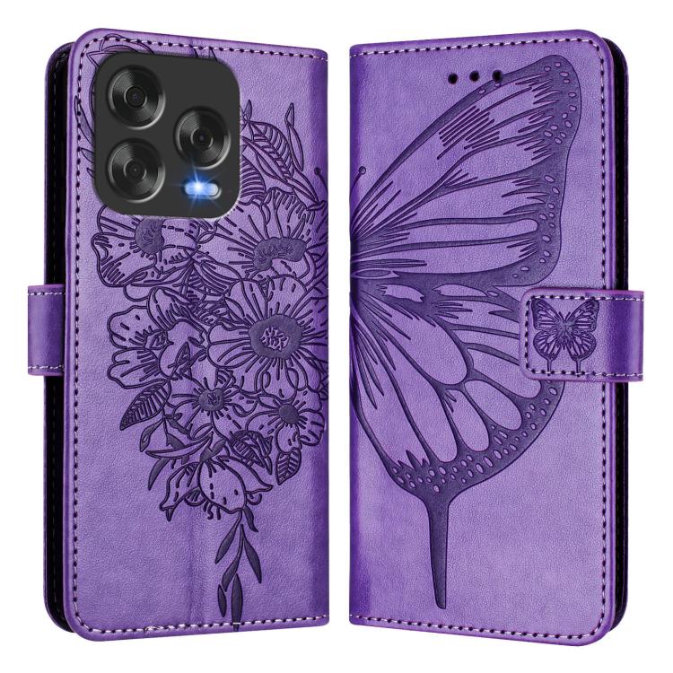 Funda de Cuero para ZTE Blade V70 con Diseño de Mariposa en Relieve (Morado)
